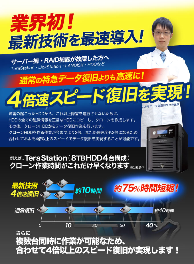 PCに直接接続することなく専用機材を用いることで、Windows 、Mac幅広い環境に対応したデータ救出システムを使用。安全かつ 最大SATA3.0 (6Gbps)の高速転送データ救出を実現。 |